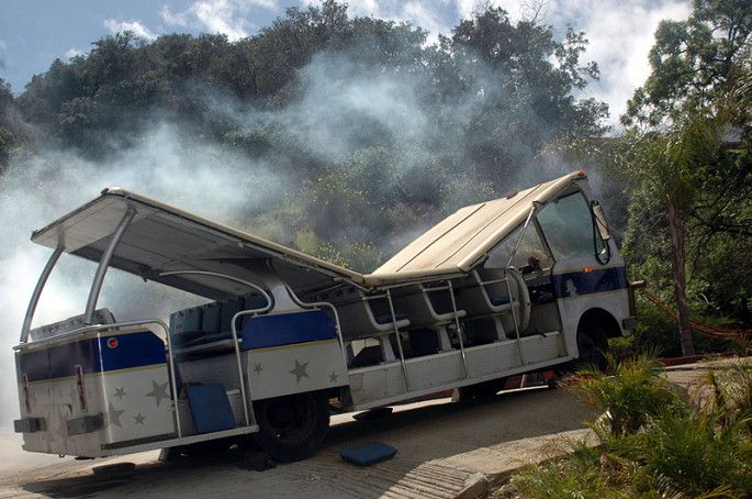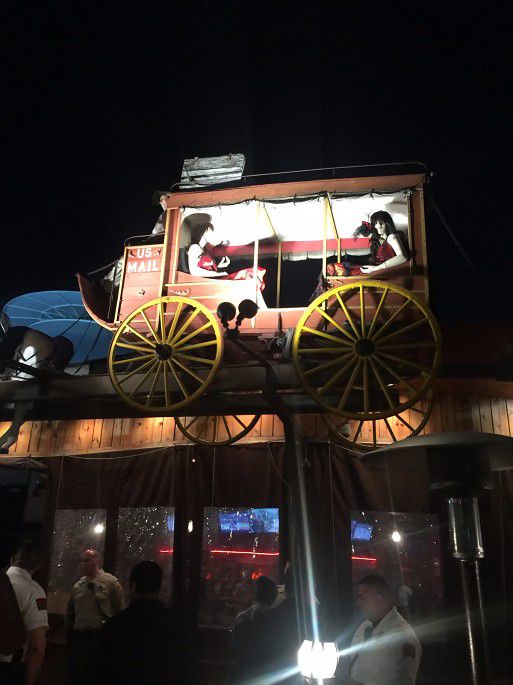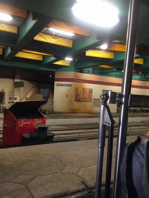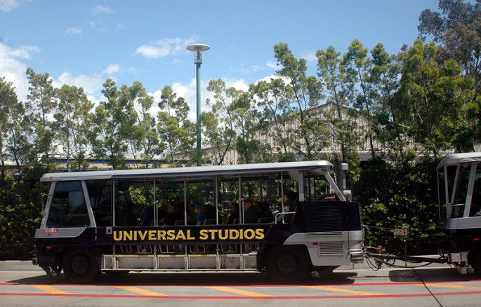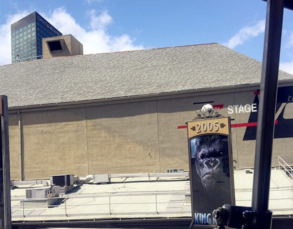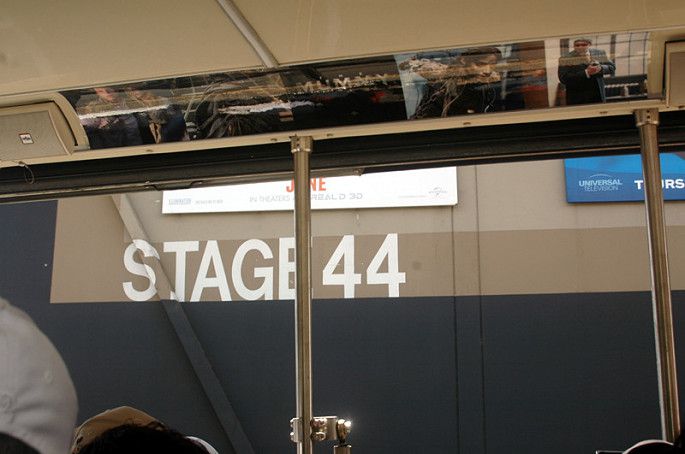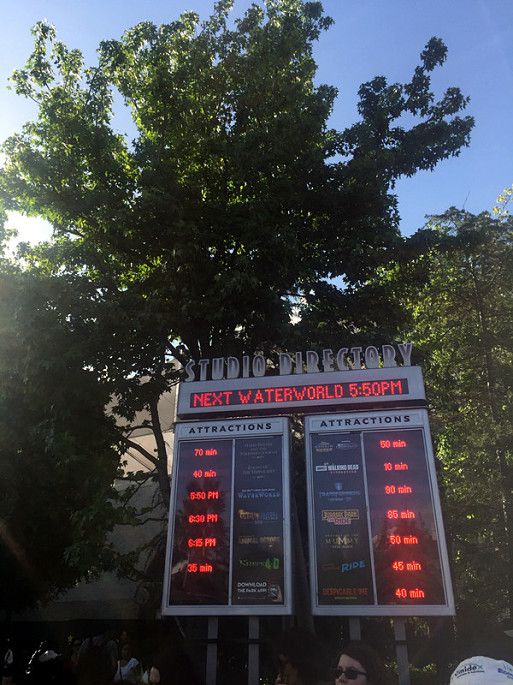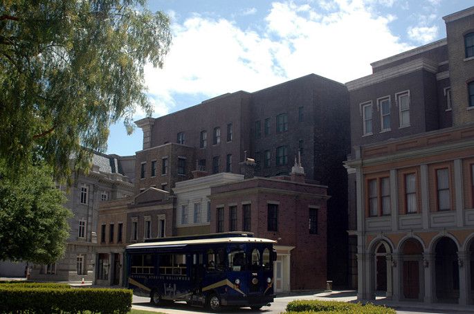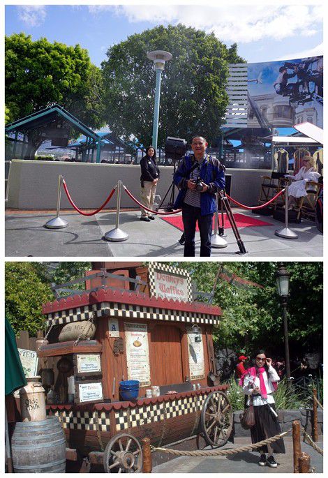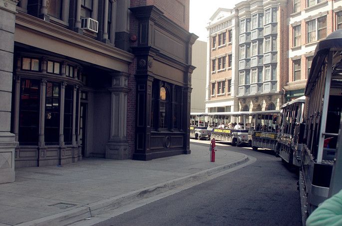 园区有一个项目“影城之旅”也非常有趣,是乘坐小火车参观。每天都有少数几趟车是普通话服务的,我们那天的时间是12点,在车站首先查看了tour开车的时间表,看好时间再上车。这个项目需要60分钟。坐上小火车,每个车上配有一个讲解员,整个过程都在车上进行,出发先领一个3D眼镜,可以在车上观看和体验诸如洪水、地震,爆炸、飙车等等场景。这些都是好莱坞影片的拍摄场景,我们穿梭在各种stage之间,项目高度还原各种好莱坞经典电影的经典场景,讲解员一边讲解,车上的小电视一边播放对应的电影片花,有趣极了。