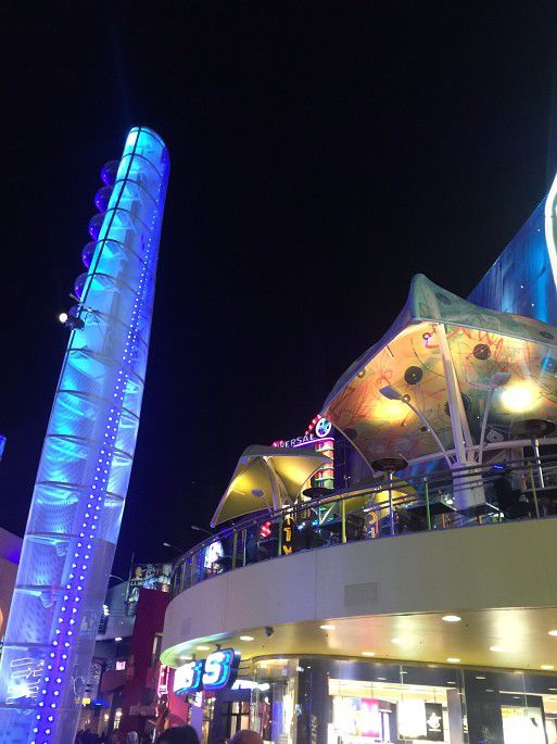 夜色中的环球城市大道,霓虹灯闪耀,各种餐厅,影院生意兴隆。