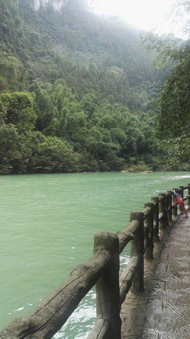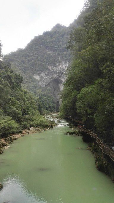 到达景区后先附近找到酒店安顿下,刚好四点来钟,还有时间逛一下大七孔,明天整天时间留给小七孔。随后步行至售票大厅,买票进去,走一段公路,一湾碧江呈现眼前,正是樟江,水色鲜艳,似蓝似绿,光彩闪闪,相当漂亮,右手边就是大七孔的入口了。