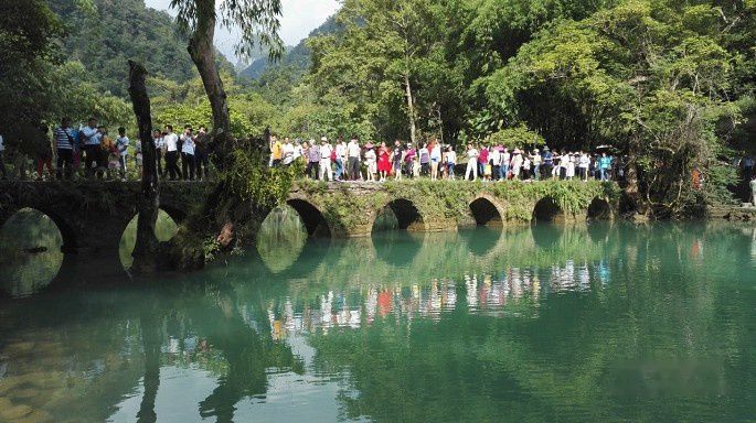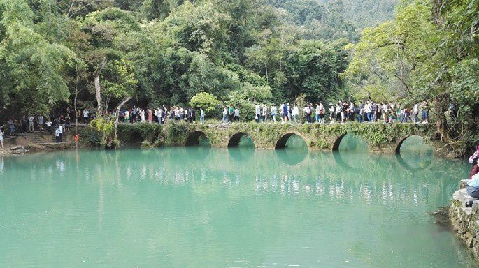 然后右行,不远处便是小七孔景区的标志小七孔古桥了。这是一座小巧玲珑的七孔古石桥,桥长25米,桥面宽4米,拱高4米,建于清道光年间。桥由麻石条砌成,桥身爬满藤蔓和蕨类;古色古香的桥下是绿得令人心醉的涵碧潭。两岸古木参天,巨大的虬枝沿着桥伸臂,宛如巨伞撑在桥上。