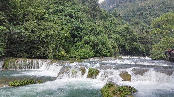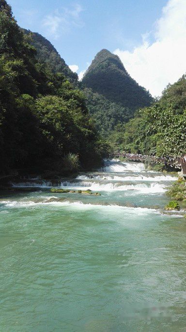 看完古桥,沿栈道前行,峡谷中是68级跌水瀑布,层层叠叠,蔚为壮观。