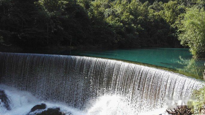 很快到达卧龙潭,筑坝引水行程,坝如弯月,坝上水色宝蓝,色彩夺目,瀑布纷纷而下,仿佛一弯珠帘,潭边怪石奇树林立,潭外水声轰鸣,四周高山紧锁,可谓一大经典景观,风景名片,是各大纪录片中的常客。