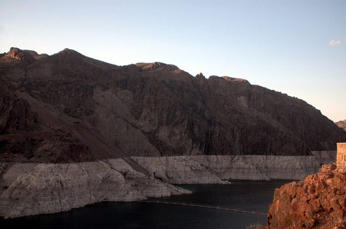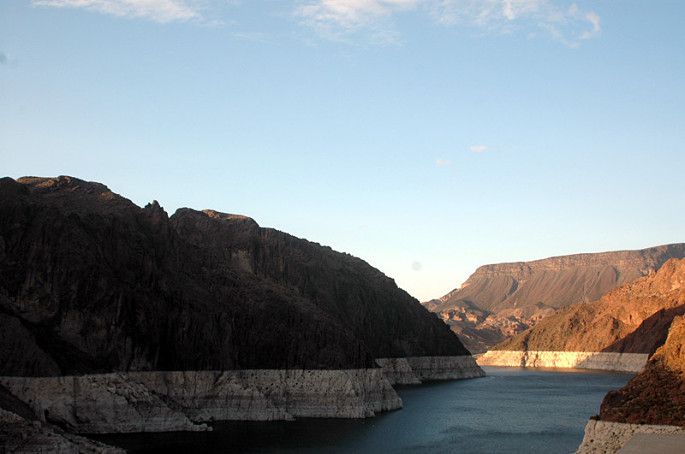巍峨的水坝拦成了米德湖(Mead Lake),整个湖的面积105.27平方公里,深152米,湖岸线长885公里。,成了美国最大的人工湖,防止了下游过云频繁发生的洪水,使长期以来桀骜不驯的科罗拉多河,变成了温顺的河流,成功调节了汛期和枯水期的流量。