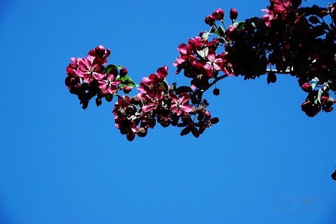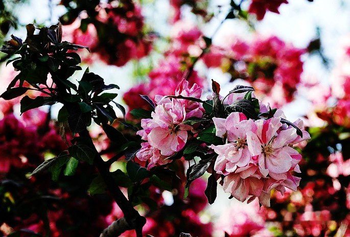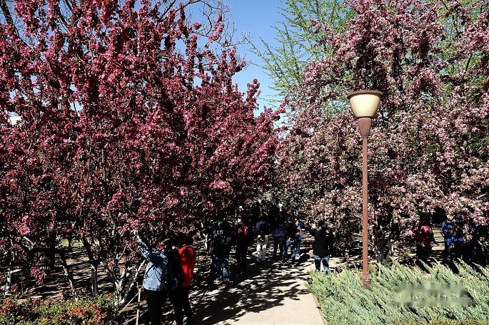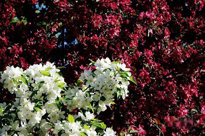 果然是已经到了盛花期,不但西府海棠全部盛开,那些晚一点开的北美海棠也都满树红花了!