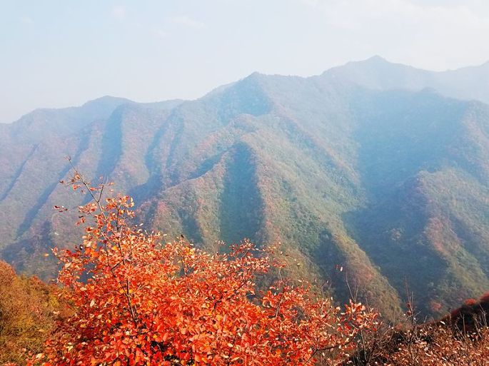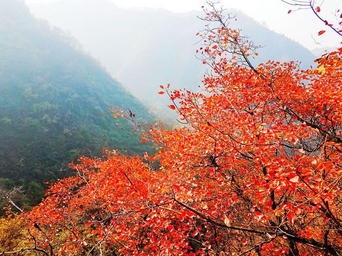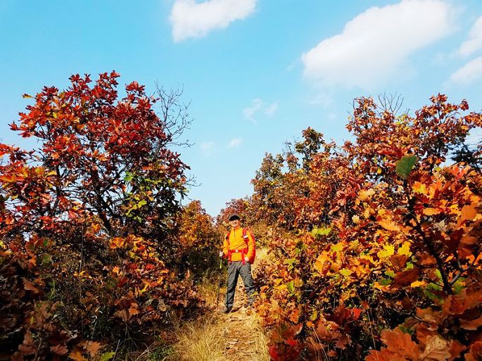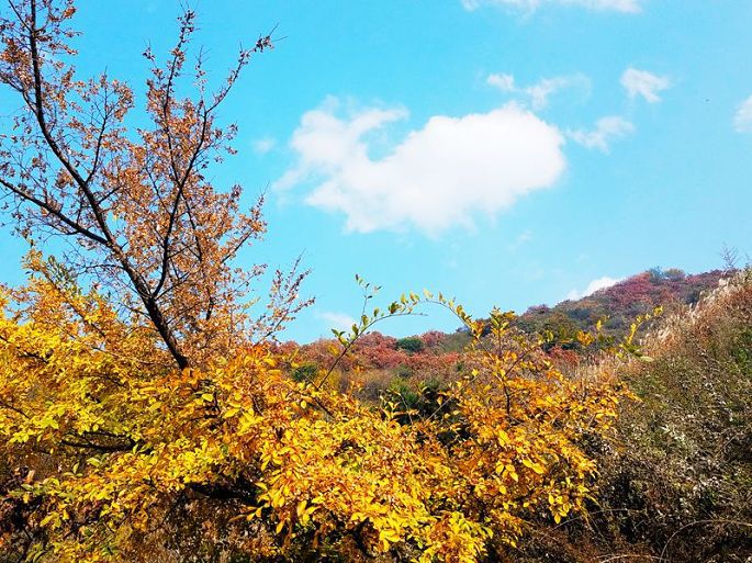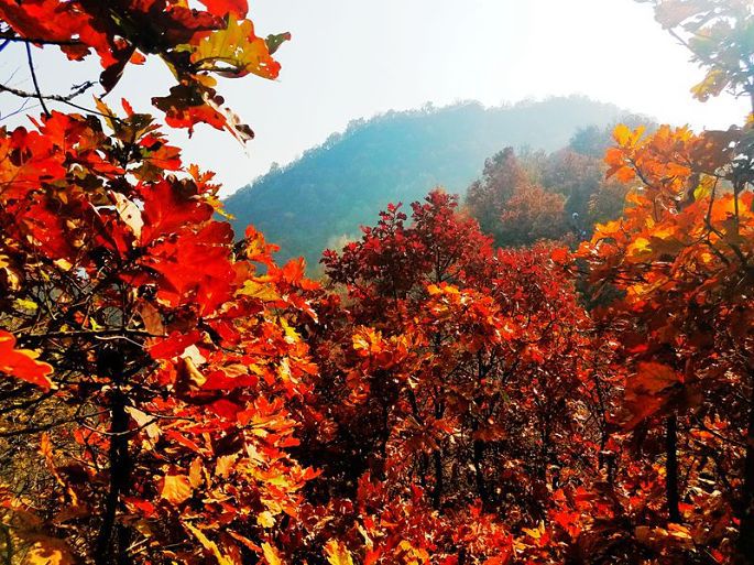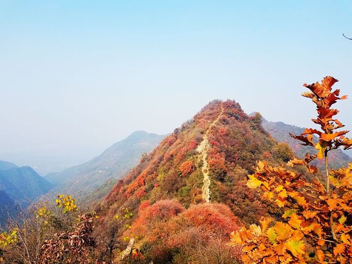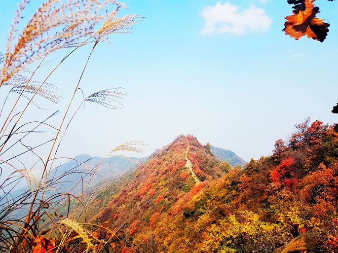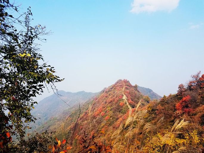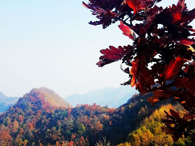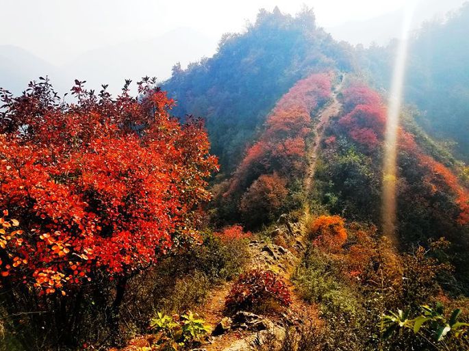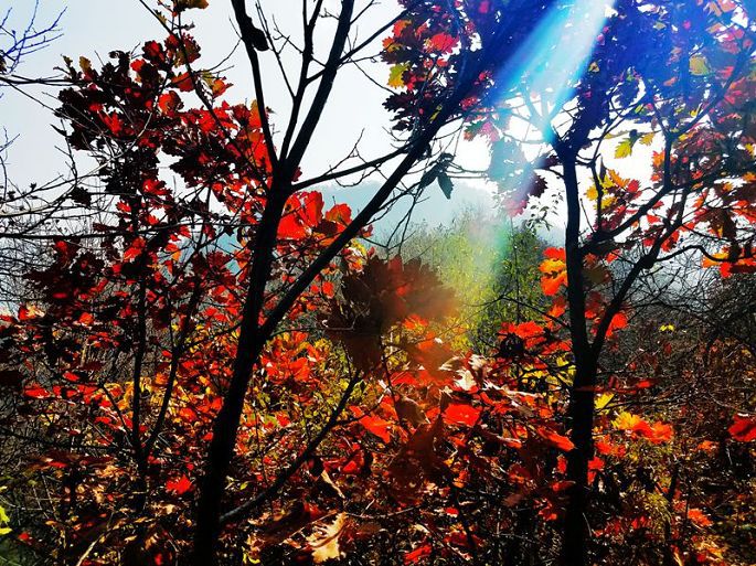 到达最高处的第十二道天门,折向山梁,瞬间便沐浴在暖暖的秋阳之中,直到此时也才能看到满山梁上的红叶和黄叶。