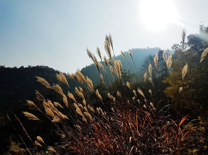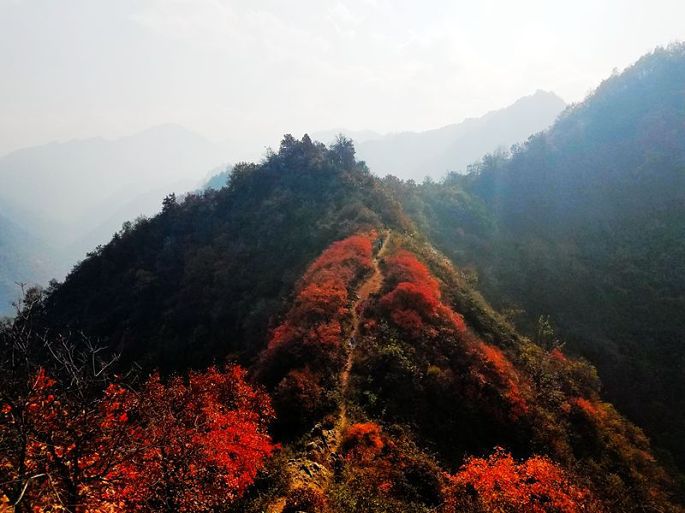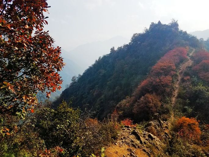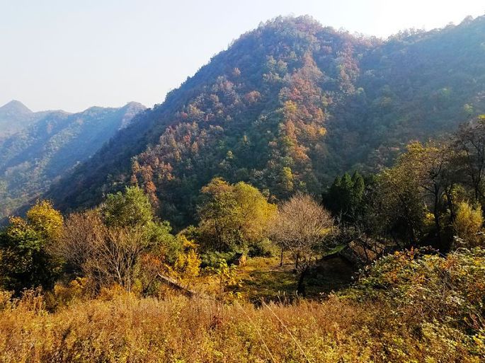 下午2点半,拔营出发,沿峪东面另一道山梁下山,但山势更为陡峭,无限风光在险峰,最后的秋色在山梁,起伏的山梁,色彩斑斓,斜阳映照下,景色更加美艳,队员们驻足流连,拍个不停,一步三回头。