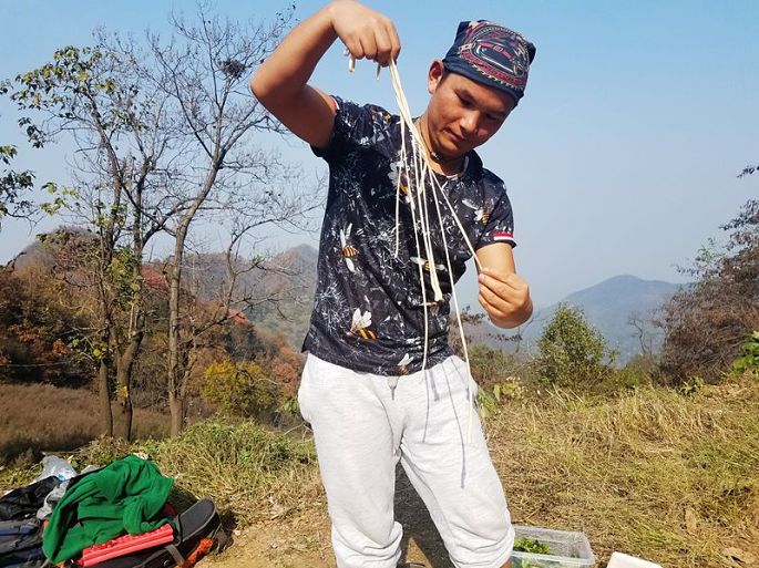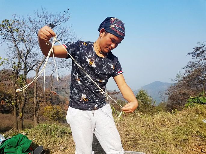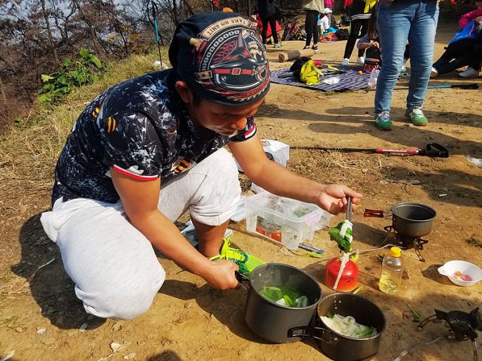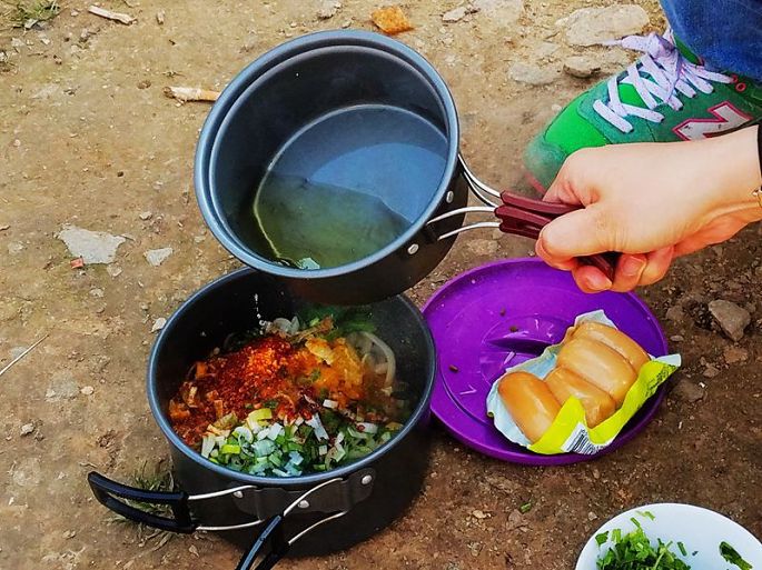 中午11点半,到达山上预定的扎营点,在唯一一家农户门前的空地上休息、吃饭,晒晒太阳,领队之一的“笨蛋”,手脚麻利,能干勤快,为我们做起了油泼面,只见他一人,点火烧水、抻面下锅、倒油加热,虽是野炊,葱花、大蒜、香菜、辣子等佐料,一样不少,不多一会儿,随着滚油浇在辣子面、葱花和大蒜上发出的嗤啦声响,一锅热热乎乎的油泼面条就出炉了,寒冷深秋,在山上能吃到一碗这样的油泼面,自然感到格外地香。