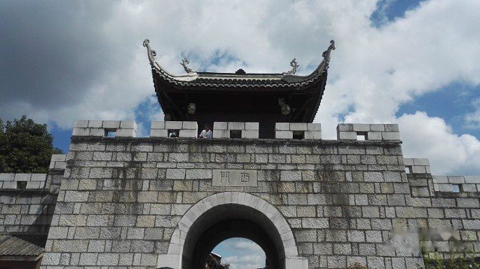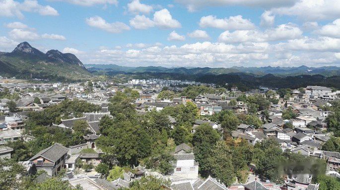 登上城楼高处,眺望古镇,远处群山逶迤,近处楼宇交错。