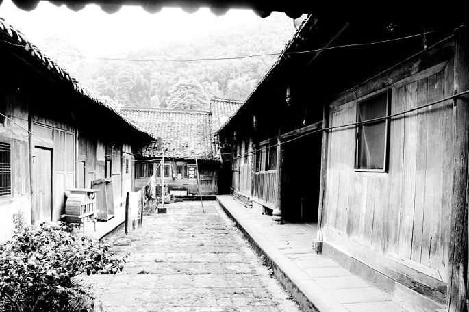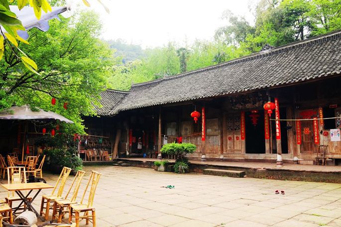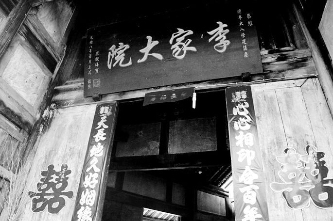 在这茶山脚下,绿树、竹林掩映之中的那片黑瓦房,便是李家大院。李家大院始建于清咸丰年间,坐西向东,背山面谷,属于穿斗抬梁、单檐悬山式木结构建筑,历经50多年才终得完成。位于大院西侧,还有一个保存较好的造纸作坊遗址。
