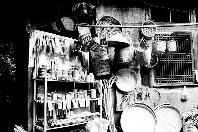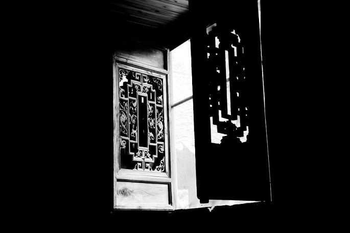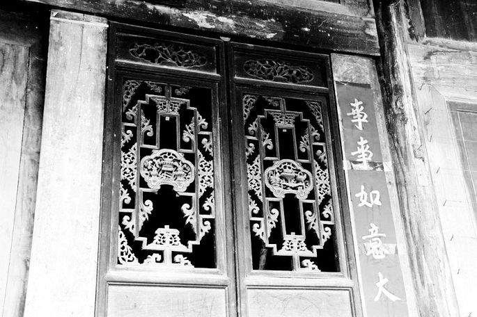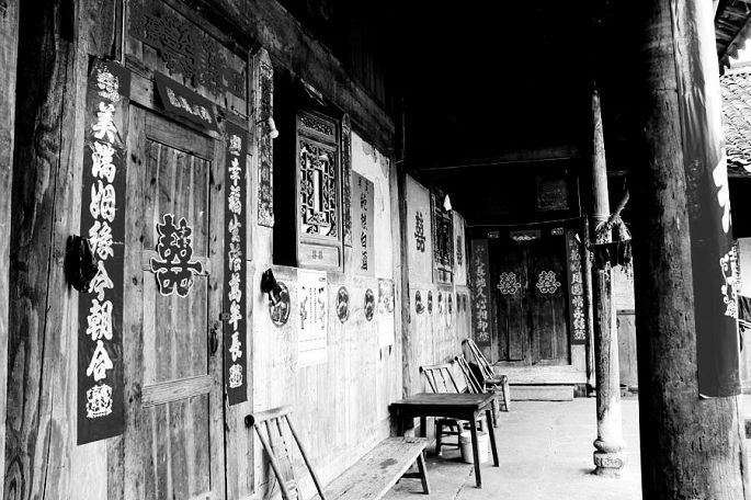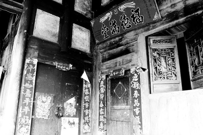 沿曲折的石阶步步登高,由大门跨入,左拐一进大院,首先吸引我的是那一面墙上、竿上挂着和摆满的农家用的竹编竹器,有竹筒、竹篓、竹筛、竹筐等等,不一而足。整个院落虽历经百年风雨沧桑,基本还是原貌原样,尽管很陈旧古朴,但这正是我想看到的,尤其那木质窗棂雕刻,虽已有些斑驳,但生动形象、细腻灵巧,技艺实在精湛,让人驻足流连,赞叹不已!
