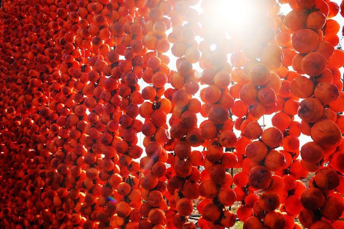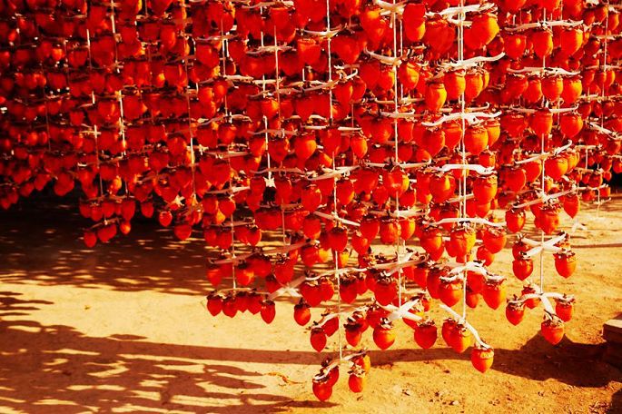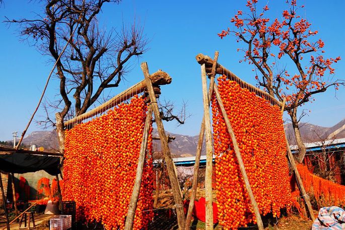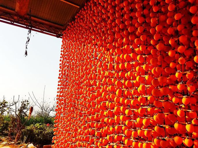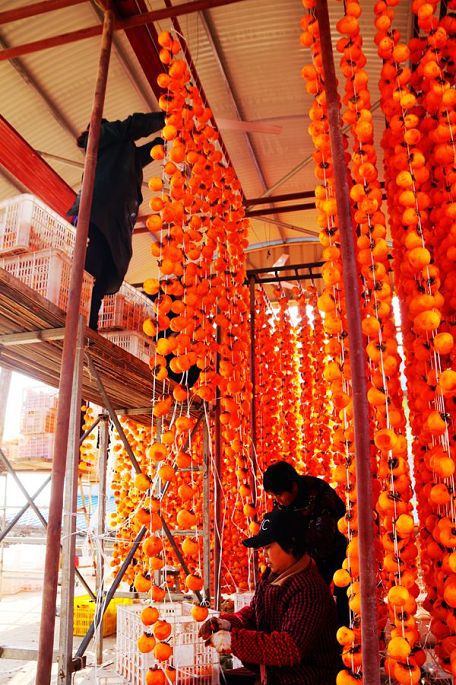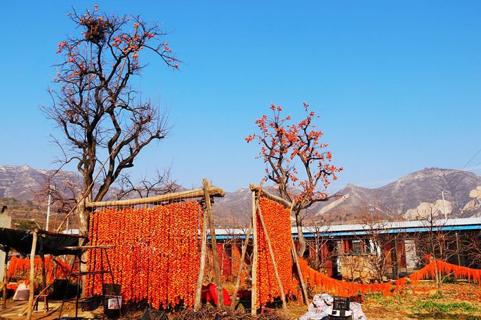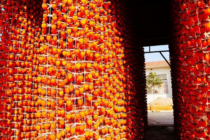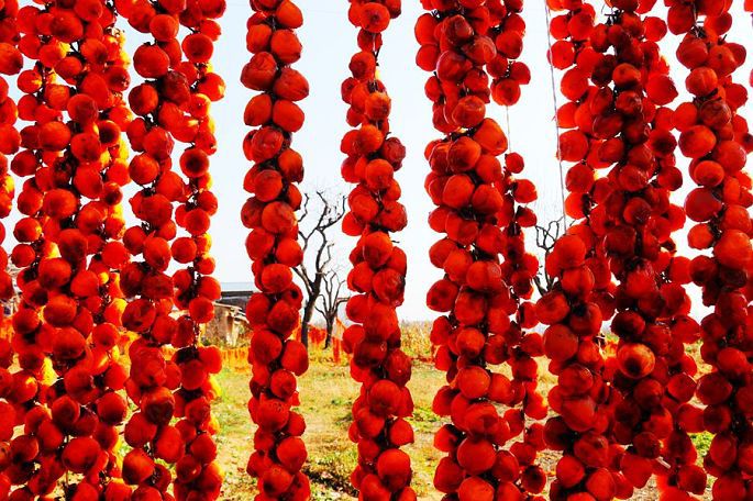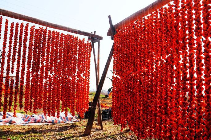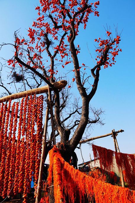 “柿子红了”,现已注册成为当地特色柿饼的品牌名称。一排排、一串串,红红的柿子,高高地挂起,宛如一盏盏喜庆的小红灯笼,成为日渐萧疏荒寂的冬日里,渭北乡村中的一道最为靓丽的风景。