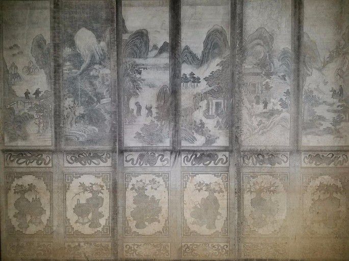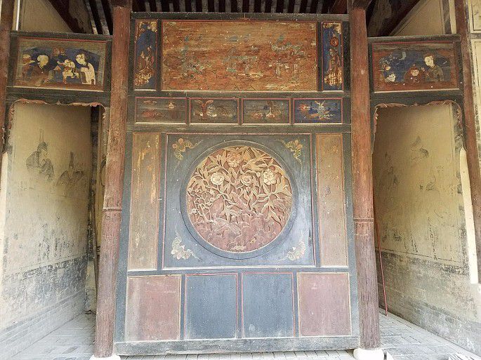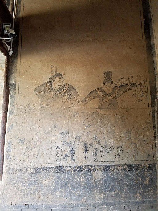 寝殿(后殿)廊下前沿连贯东西的一根粗大蒿木,令人匪夷所思,因蒿属草本类植物,当年枯次年生,且目所见只是整根蒿木的三分之一,有“蒿木担子四丈八”之说,蔚为奇观!寝殿后面墙壁上保存有多幅色彩艳丽、线条流畅的珍贵壁画,内容有黄帝赐衣、西陵制衣、战蚩尤等,却不得见。