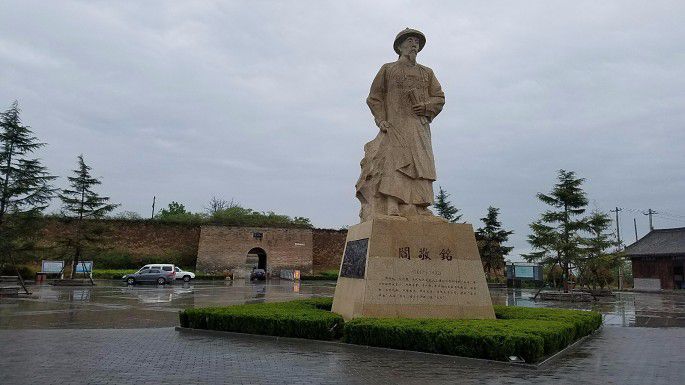 到大荔县城,吃了午饭,肉夹馍和麻食,陕西特色风味。后乘公交去朝邑镇大寨子村丰图义仓,用时半个多小时。义仓在村南相邻,仓前建有公园,当年倡议修仓的东阁大学士闫敬铭巨像威立。有一些游客,三五成群。