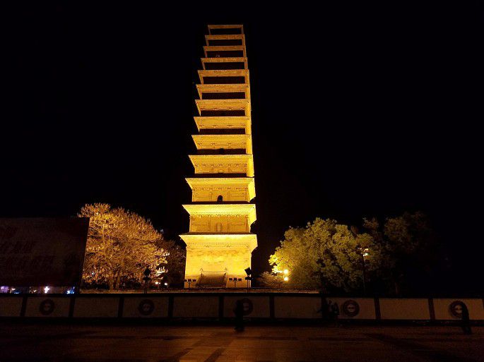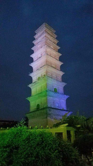 汽车站旁下,去蒲城的车也要走。到蒲城天近黑,步行去蒲城中学,过南庙(武庙),祀关老爷。蒲城双塔之唐塔就在校内,门卫大叔挺好,直接放进去。夜色中唐塔灯耀,别有味道。塔原系慧砌寺舍利塔,比西安慈恩寺大雁塔早。