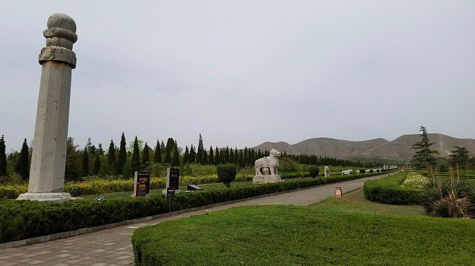桥陵地上所存贵在神道石刻,有华表、獬豸、鸵鸟、石马、翁仲、石狮等,宏伟大气,盛唐风范,不愧“桥陵石刻甲天下”美誉。其他还有阙楼、蕃酋殿遗址及周围大量的陪葬墓。