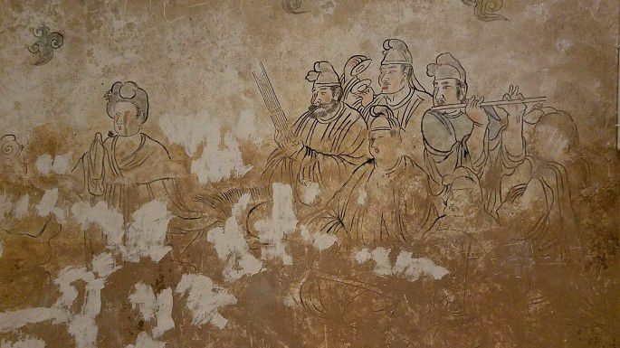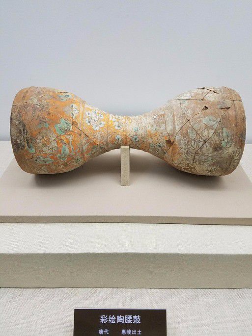 馆内展品不多,却很有唐色,主要是各类俑、地宫介绍,一件漂亮珍贵的彩绘陶腰鼓很别致。唐代帝陵分布模型图引众聚观,这里是关中十八唐帝陵的一个集中带。地宫依是森凉,最美是壁画,皇家宫阙、仪仗、宫女、仆从、乐舞等色泽鲜明,生动传神。石棺内外遍刻人物、花卉等图案。