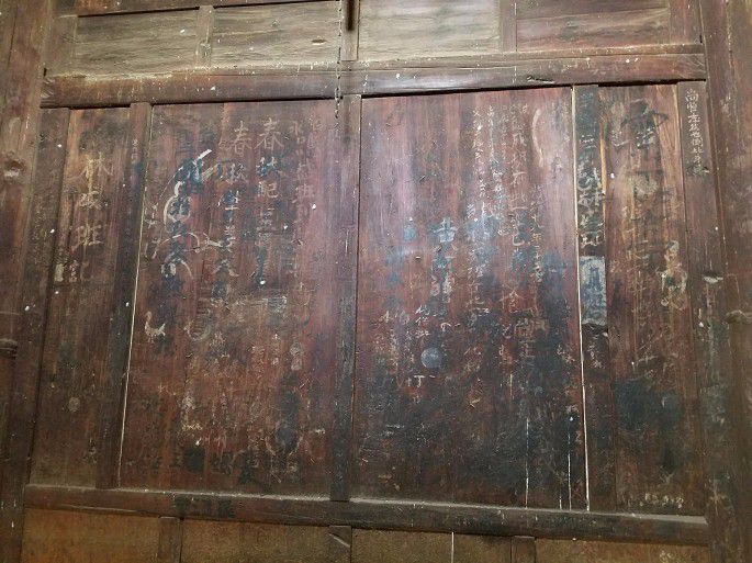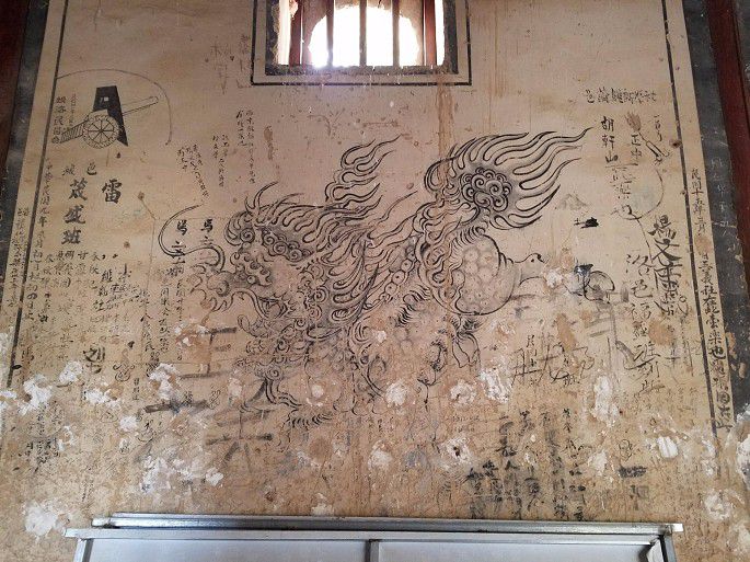 里边有侧门入仓颉庙,古柏参天,古建静立,保护较好。古柏还有各种名字,如柏抱槐、扁枝柏、再生柏、二龙戏珠柏、仓颉手植柏等。戏台楼建于清代,两边各一并列,壁画尚存,前台两侧建有八字音墙,可增强音响效果。台上墙壁留有不少“墨迹”,包括戏班留记,生活气息浓郁,让人倍感亲切。