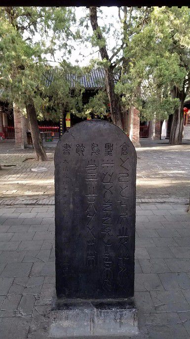 白水客运站坐上去史官镇的车,涉重山,过洛河。仓颉庙距镇不远,庙前下车。庙正门未开,前有照壁和护庙柏。游客不少,从景区新门进去,迎面广场一群学生,广场周围满是汉字的图释和小篆、隶书、楷书乃至金文、甲骨文的写法,别具一格。博物馆在整修,没开放。