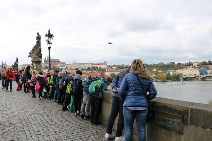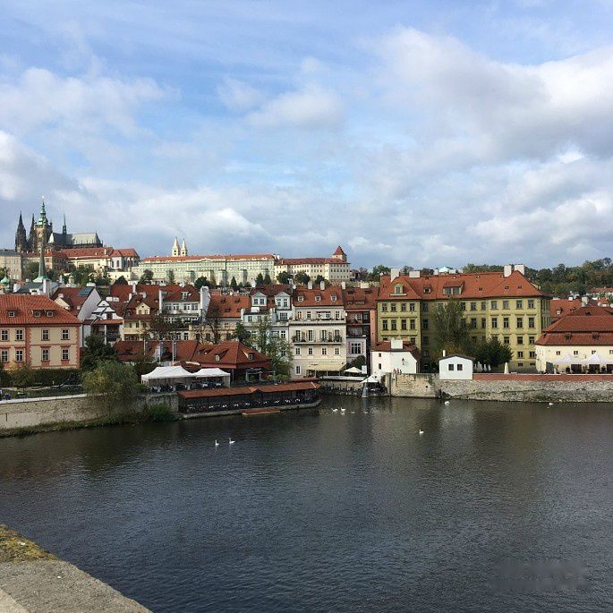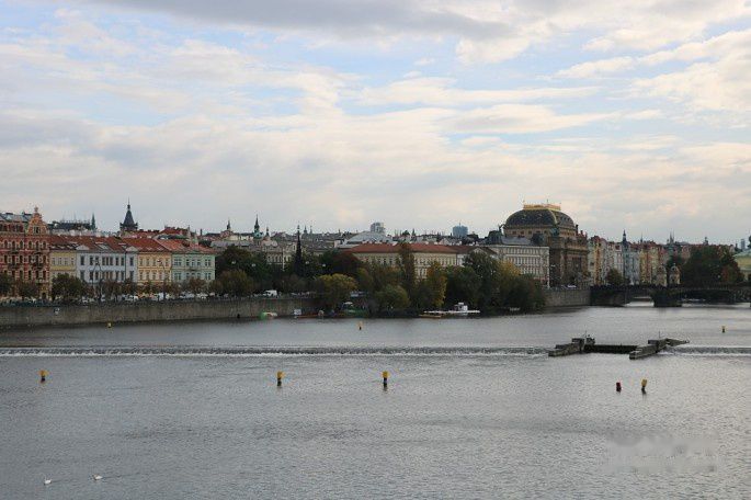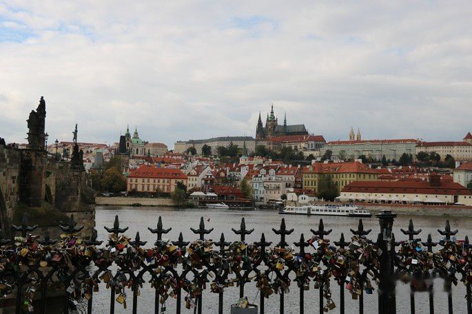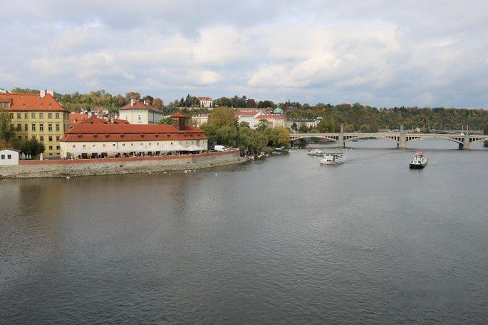 伏尔塔瓦河的激流撞击着桥墩,河面上是永动的浪纹与缓缓行驶的船只,河的两岸是魅力无限的红顶白墙古建筑群,一只鸽子若无其事地在桥栏上漫步……