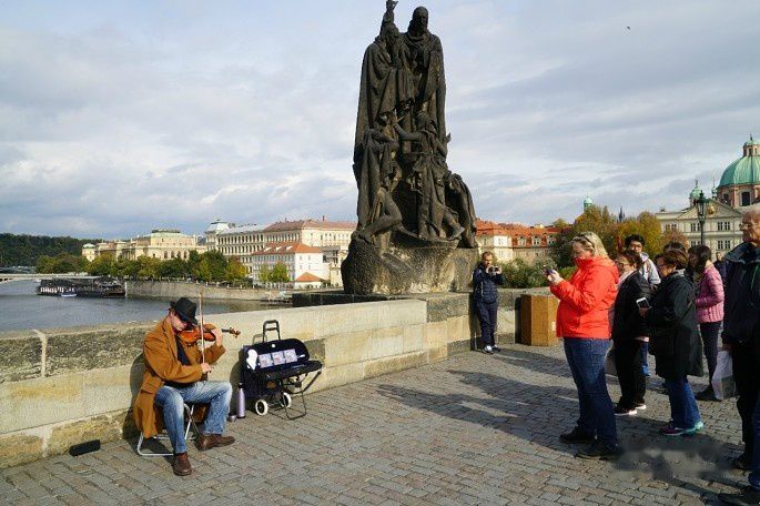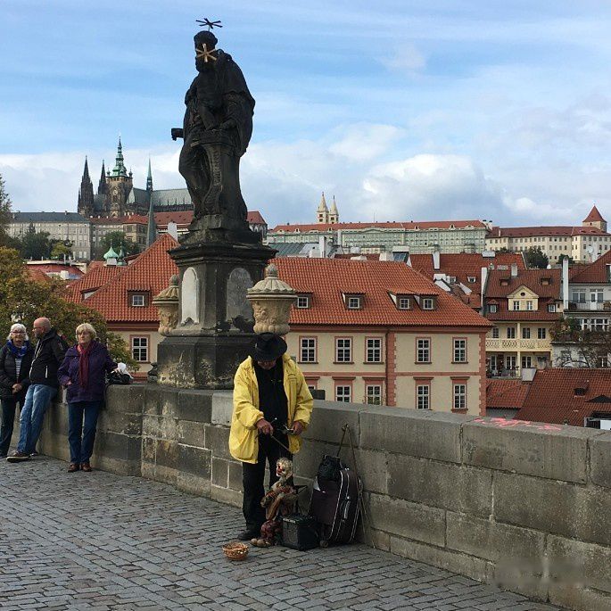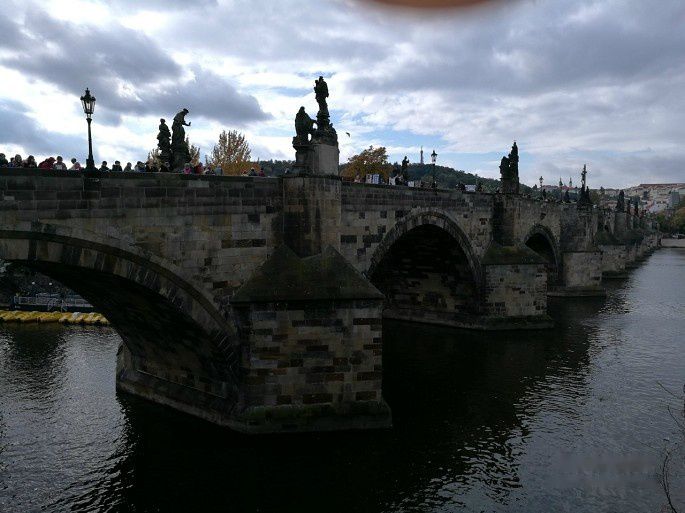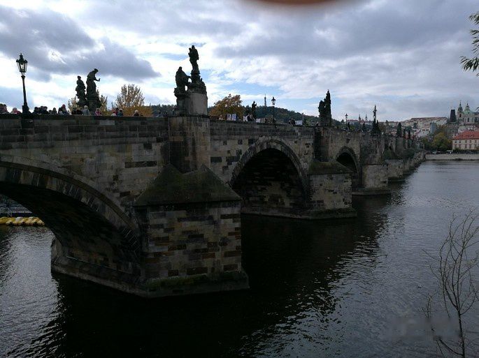 时间有限,我仅在查理桥上走了个来回。阴云笼罩下的查理桥不够明亮、不够绚丽,但给人神秘的感觉。