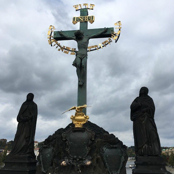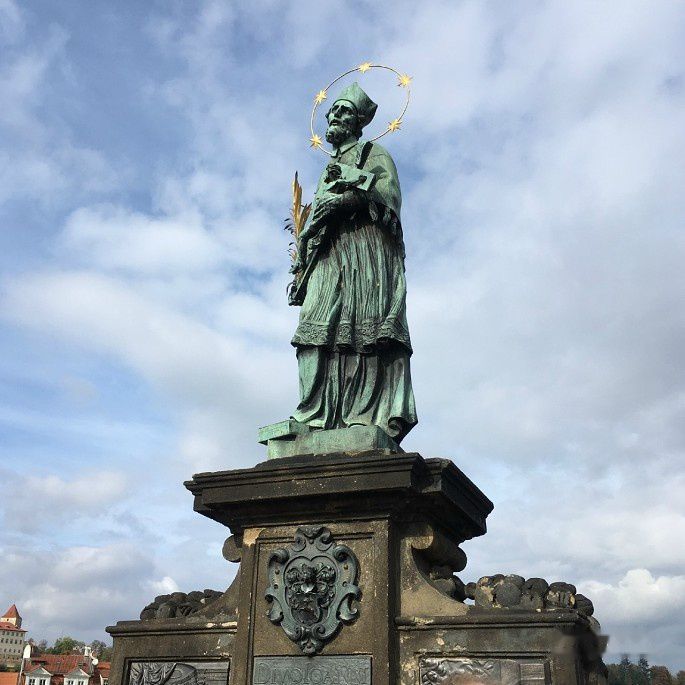 在众多雕像中,查理桥的守护者圣约翰的雕像人气最旺。圣约翰手拿象征胜利的棕榈叶,怀抱象征受难的十字架,头顶上的五颗星有三种传说。一说人们在河中发现他尸首时头上浮着五颗星;二说代表基督的五处圣痕;三说代表拉丁语tacui,意为保持沉默。