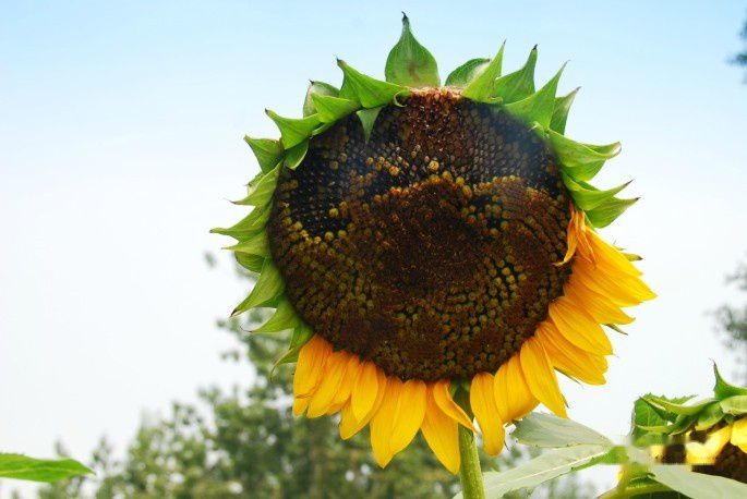 在观赏向日葵时不知朋友们是否注意到,向日葵并不是朵朵向日开,现实颠覆了“葵花朵朵向阳开”这个我们从小就知道的,千真万确真理。我在教学中曾带着学生们阅读过一篇科技说明文,文中讲向日葵从发芽到花盘盛开之前这一段时间,的确是向阳的,它叶子和花盘在白天追随太阳从东转向西。但是,花盘一旦盛开后,就不再向阳转动,而是固定朝向东方了。为什么最后要面向东方而不是其他方向或朝上呢?这可能是自然选择的结果,对向日葵的繁衍有益处。向日葵的花粉怕高温,如果温度高于30摄氏度,就会被灼伤,因此固定朝向东方,可以避免正午的直射,减少辐射量。但是,花盘一大早就受阳光照射,却有助于烘干在夜晚时凝聚的露水,减少受霉菌侵袭的可能性,而且在寒冷的早晨,在阳光的照射下使向日葵的花盘成了温暖的小窝,能吸引昆虫在那里停留帮助传粉。向日葵,是由于它生长前期的幼株顶端及中期的幼嫩花盘会跟着太阳转动得非常明显而得名。
