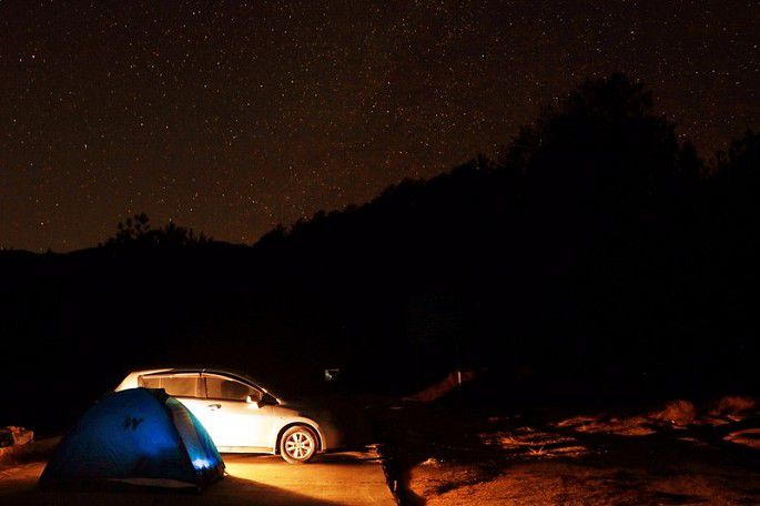 车到铜锣湾水库,天色已暗,却还有少少霞光。在网上找的攻略到此为止,基本上只说水库后就是基耕路,要越野车高底盘车才能到达枫树湾营地,吓得俺心肝卜卜声跳,加上天色全暗了,为免出现不必要的差错,就地扎营。