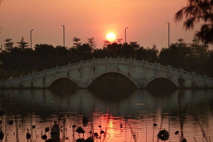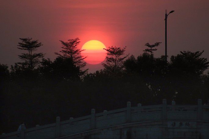 回到飞来湖边,红彤彤落日正好,结束两天开心赏花之旅。