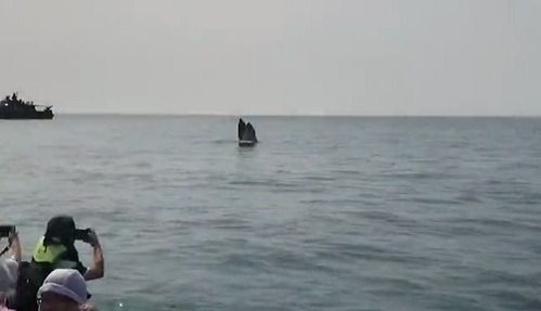 看到不远处海面有动物冒出头,船家说“是鲸鱼!”。大家哗然,慌忙掏出手机瞄准鲸鱼。