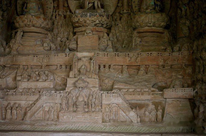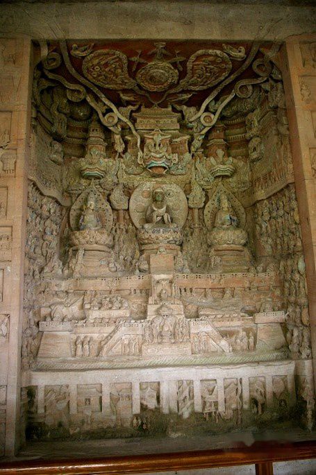 及及第245号观无量寿佛经变相等都是其代表作品。尤其是第245号观无量寿佛经变相内容丰富,层次分明,“西方三圣”、“三品九生”、“未生怨”、“十六观”及伎乐天人、楼台亭阁等,在中国石窟同类题材造像中首屈一指。