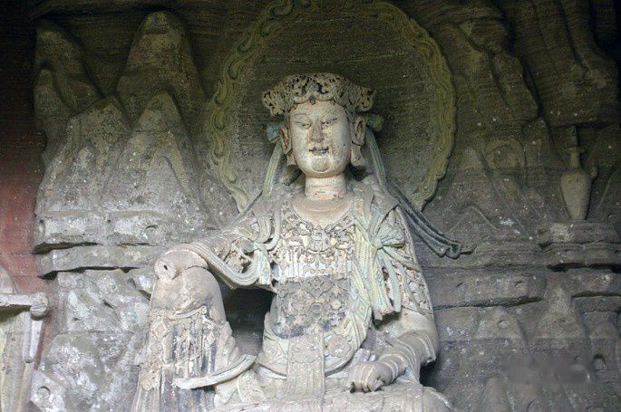 尤其是建于公元1142~1146年间的第136号转轮经藏窟的几尊观音造像以精细恬美的面部刻划反映其内心之宁静,以玲珑秀丽的衣冠装饰显其身份的高贵,极富中国民族特色。
