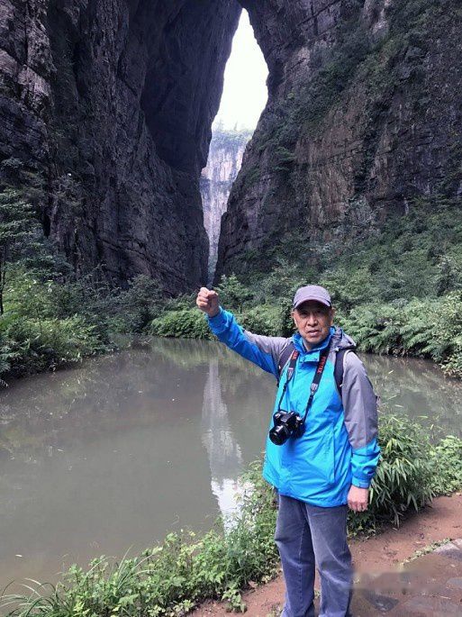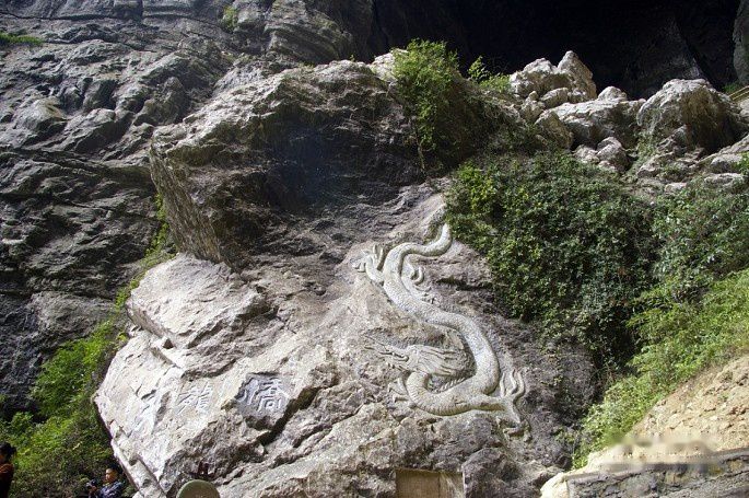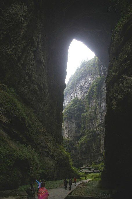 天龙天坑的尽头是“青龙桥”。桥孔高而窄,从适当的角度看,犹如青龙偃月刀,这里成为众多游客留影之地,我也随俗拍了一张。