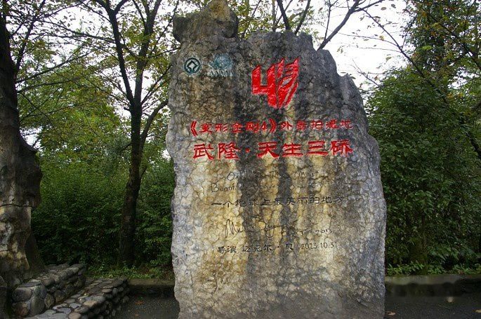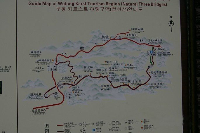 武隆离重庆150公里。不算很远,但沿途穿山越岭,数千米长的隧道一个接着一个,车速较慢,将近11点钟才到达武隆游客中心。按照事先拟定的路线,乘景区观光车去天生三桥及天坑景区。天生三桥由天龙桥、青龙桥、黑龙桥组成,平行横跨在羊水河峡谷上,三座石桥将峡谷两岸的山体连在一起,三桥夹两坑——天龙天坑,神鹰天坑。
