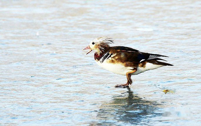 有点意思的是其中还有一只秃毛的鸳鸯,不知道是亚成还是打架输了,总之是非常狼狈,但从羽色上可以判断是公的鸳鸯无疑。