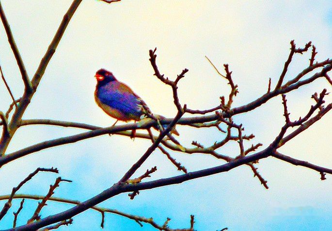 继续等待,突然发现墙内的金银木上有一只鸟,立即抓拍了一张,也很快飞离了。回家放大一看,居然是朱雀!