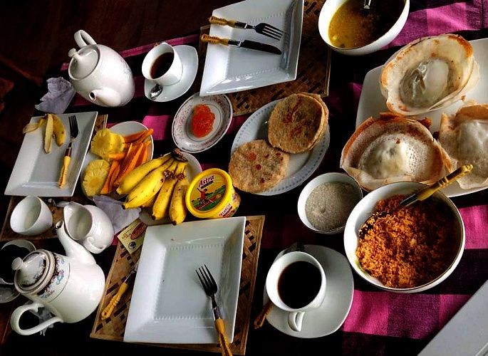下车的时候已经有勤劳的dudu车司机拉客的等着了,原本想来不喜欢拉客的,但因为临时改变了行程,也就对polonnaruwa的住宿没有太多的准备,外加天也已经暗了,于是我们就跟着拉客的走了。其实从性价比来说被拉去的这家客栈性价比还是不错的,有个花园,小小餐厅外是大片的稻田,房间的设施依旧简单,但洗手间还是过得去的,重要的是有热水,因为那一晚其实有点凉,加上赶了一天的路了,洗个热水澡比啥都好。房价2000R折合人民币100吧。他们家的早晨是我在斯里兰卡吃过的最好吃的一顿早餐,不过价格也不菲500R每人。但看在在美景前吃着真心还不错的早餐,多个200R也就无所谓了。