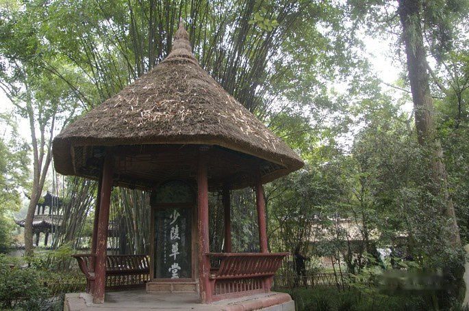 杜甫草堂博物馆现有展馆面积近20万平方米,辟有南,西,北三个大门,旧址基本以西门起始的中轴线展开:大廨——“诗圣著千秋”陈列馆——诗史馆——柴门——工部祠——“少陵草堂”碑亭——茅屋旧居。其中少陵碑亭是杜甫草堂最具代表性的建筑之一,它是一座以茅草作顶的亭子,内树有一石碑,镌刻“少陵草堂”四个大字,笔力浑厚,笔姿秀润,是雍正皇帝之弟果亲王允礼所书。