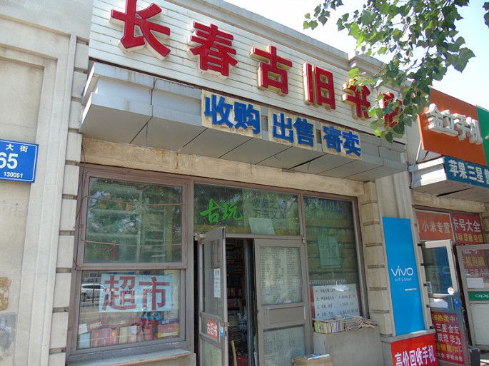 再向南走,穿过几条胡同,经过了5幢二层平房和长春机关第一幼儿园,发现长春机关第一幼儿园外墙的门市房有一家旧书店,便走了进去。书店老板是一位七十多岁留着长胡子的白发戴着眼镜的老人,他身旁墙上的书架堆满了旧书,其中有一些书是他在二十年前收的,就显得更加珍贵了。我翻看了几本关于长春的书,但没有买,和老人攀谈几句就离开了。有趣的是,就在这家书店的不远处也有一家旧书店,只是门锁着,后来得知也是这位老人开的,我家的书和这位老人比起来真是小巫见大巫了。