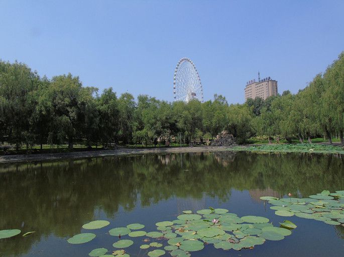 这时胜利公园门前正在修地铁,立有毛主席雕像的正门进不去了,我们从侧门进入。刚一进公园,就看到了远处高大的摩天轮,我猜测里边可能有个游乐场,但没有走过去。