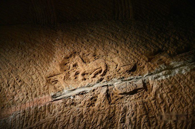 在一号石窟站立抬头10米左右处,清晰可见一幅岩画,内容是马、鸟、鱼三种动物。具体雕刻人,年代都无从考证。