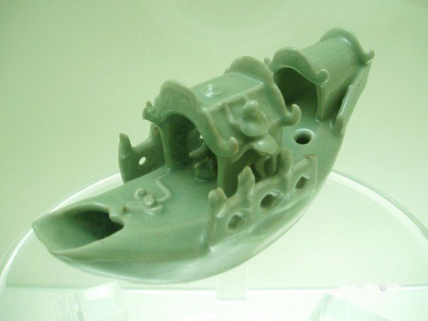 砚滴呈舟形。这件舟形砚滴出土于龙泉,胎质细腻洁白,釉层肥厚,呈粉青色。造型上运用写实手法,将一件文房用品塑造成一叶飘荡在水面上的扁舟。船形,平底,露胎,有仓棚和艄棚,仓棚船舷两侧有栏杆。舱外艄公正欲取船蓬上的斗笠,生动自然。