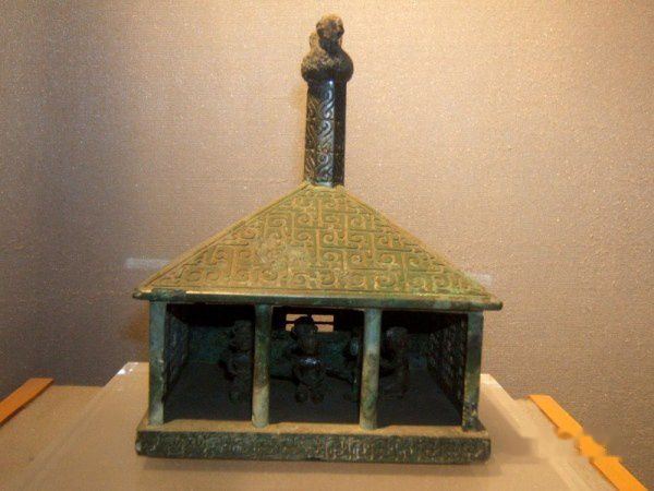 铜屋平面作长方形,三开间,三进深。南面敞开,无墙、门,立圆形明柱两根。东西两面为长方格透空落地式立壁。北墙仅在中心部位开一小窗。四角攒尖顶,顶心立一八角柱,柱顶塑一大尾鸠,柱身中空,但与屋顶不通。屋下有四阶。屋顶、后墙及四阶均饰勾连回纹,八角柱各面饰S形勾连云纹。室内跪坐六人,束发裸身。 二人双手相交于小腹,应是乐伎;其他四人或作吹笙状,或作抚琴弹拨状,或执槌作击拍鼓状,或执小棍作击筑状,当为乐师。