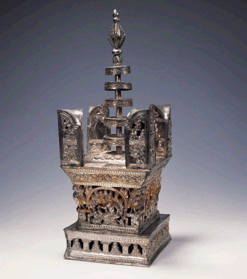 2001年杭州雷峰塔地宫出土。通高35.6厘米,基座边长12.5厘米。塔由纯银捶擛成型,整体铆焊套接。塔方形,由基座、塔身、塔顶三部分构成。