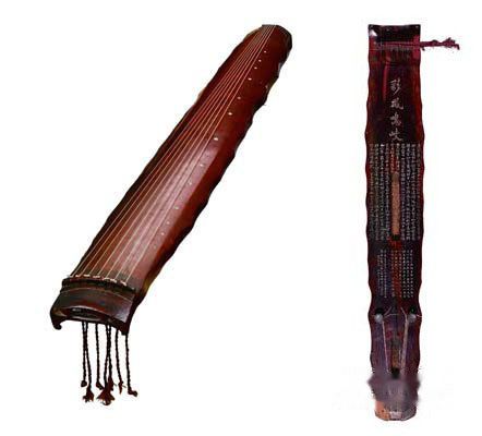 “彩凤鸣岐”琴,落霞式,唐。 琴长124.8cm,有效弦长116.3cm,额宽16.3cm,肩宽18.8cm,尾宽12.5cm,厚5.4cm。