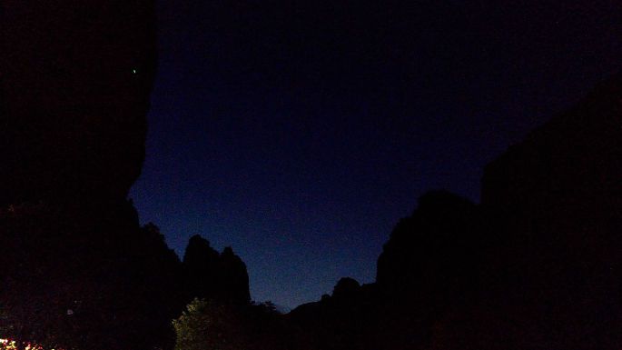 回到响头岭村,已是晚饭时间,不长的街上有很多饭店,不停地召呼游客吃饭,我们随便找了个生意好的饭店,点了6个菜,共185元,有点贵,但味道挺香,吃得很饱。吃饭时已经看见不少大巴、轿车往山上开,估计是去看灵峰夜景的。吃完饭,我们散着步就到了灵峰景区门口,此时天快完全黑了,景区停车场停满了车,门口挤满了人,有很多旅行团,售票处水泄不通,我们遂决定不进去了,在门口拍了几张夜景照,过了一会天完全黑了,山峰几乎看不清了,于是庆幸自己没有买票进去。