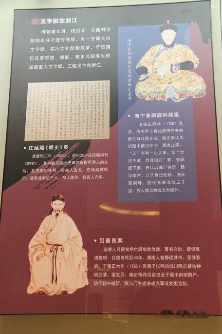 文字狱在浙江。康熙、雍正两朝发生的四起重大文字狱,有三起发生在浙江:庄廷鑨《明史》案、海宁査嗣庭科题案、吕留良案。