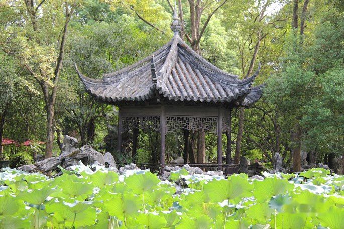 藏书楼掩映在园中,楼外有园,园中有池。园内古木参天,浓荫蔽日,夏日池中绿荷亭亭。有亭三座,曰“明瑟”、“漳红”、“沅碧”。