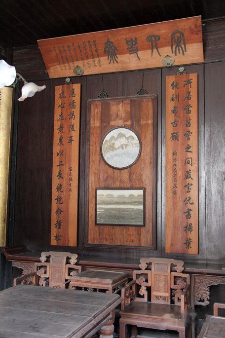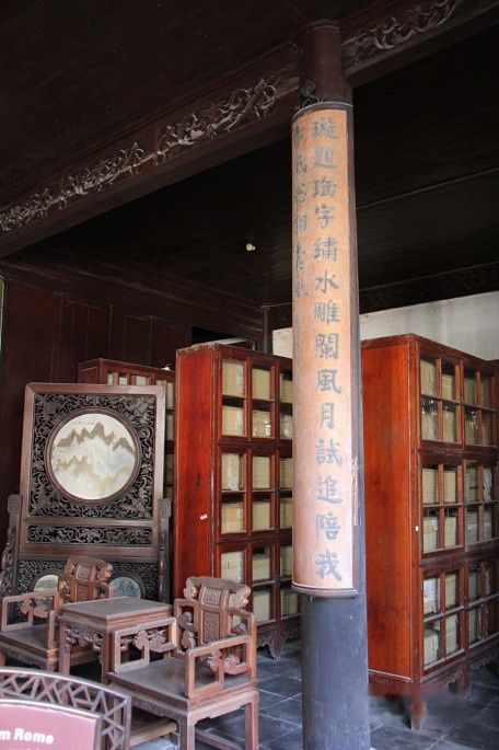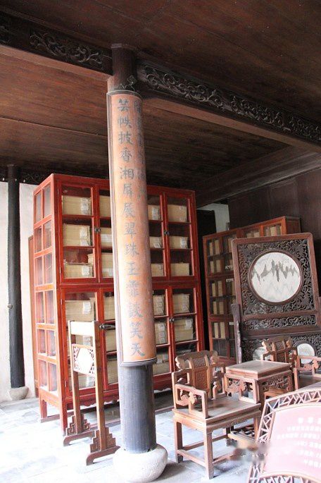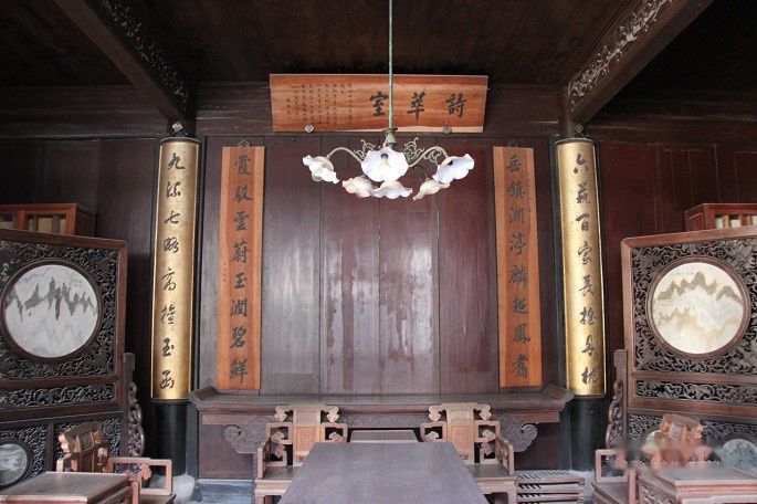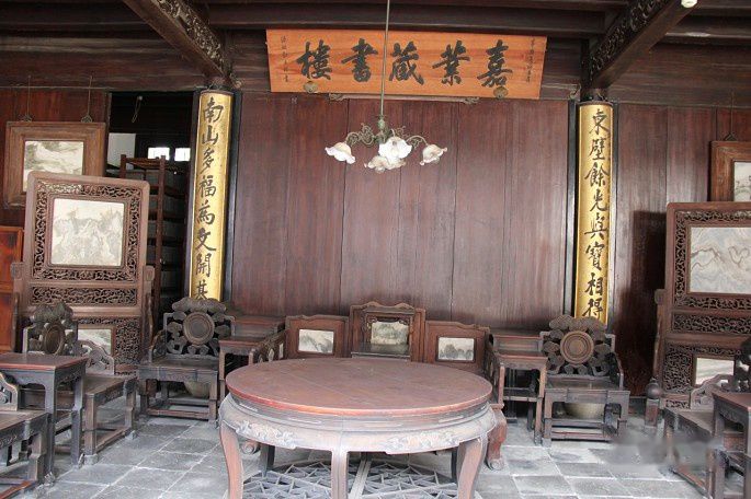 所有楼堂斋室都陈列着大理石屏风、书桌、茶几和香杞榻等红木家具,一派清代厅堂的风格。正厅 “嘉业堂”。