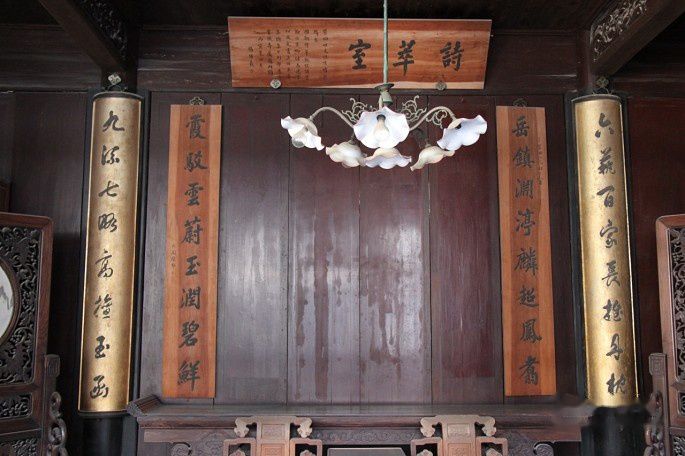 诗萃室以放置刘承干与其继父刘安澜(字紫回)共同编写的《国朝诗萃》正集续集而命名,意在纪念其继父(伯父刘安澜无子嗣由刘承干承祧)。柱联云:璇题珤字繍水雕闌风月试追陪我赤低聡翻蠹纸,芸帙香湘屏展翠珠玉霏谈笑天开图画肖瀛洲。