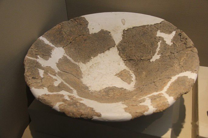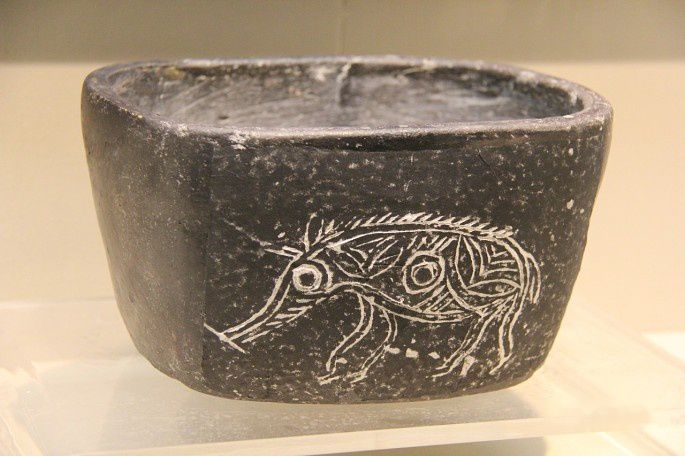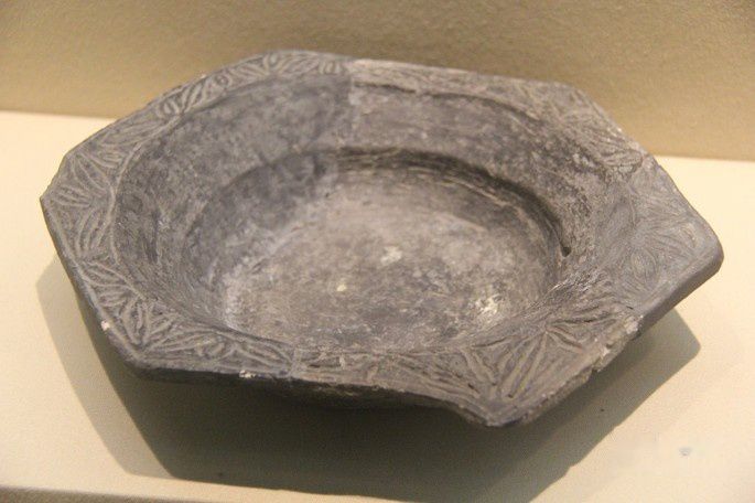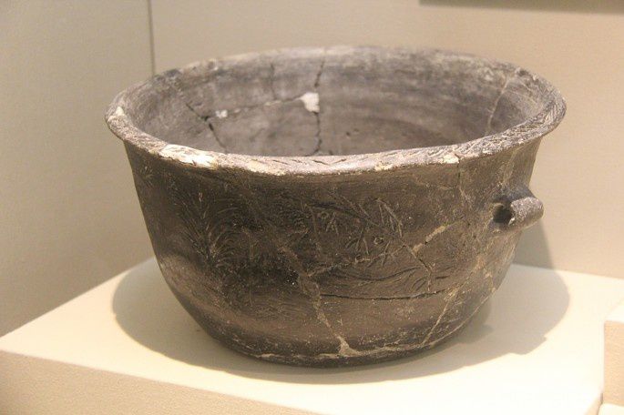 河姆渡文化刻纹陶盆,余姚河姆渡遗址出土。